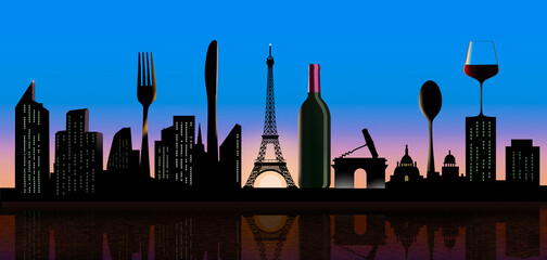 Dining out in Paris is the theme of this depiction of the city of lights skyline with the Eiffel Tower in the middle. Wine and silverware for dining support the theme in this 3-d illustration.