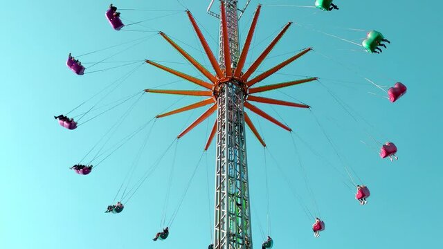People riding vertical chain swing ride in amusement park, tilt up, day
