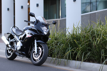 Front view of gray expensive luxurious car parked in quiet alley on sunny autumn day on blurred vehicles, walking people and golden foliage bokeh background. Transportation, parking problems concept.