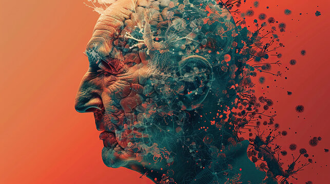 International Parkinson's awareness month concept, old man with degenerative disease logo, Mental health. Stroke, synapses and neurons interaction art, Poster, banner, card, background.