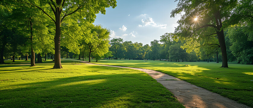 empty city green park with lawn tall trees and trimmed grass with fallen leaves on an early sunny warm morning