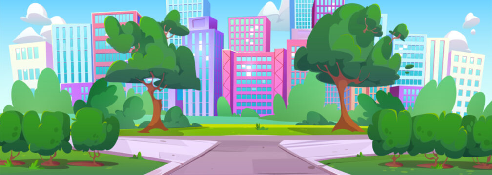 City public park with pathway, green trees and grass surrounded by high rise buildings. Cartoon vector summer time urban landscape with road in garden in downtown. Town panoramic scenery with parkland