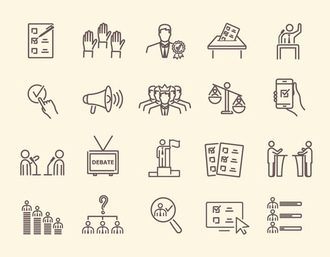Simple, black and white voting and election icons set. Collection of linear simple web icons. Form, online voting, debate, candidate rating, vote count and others. Editable vector stroke.