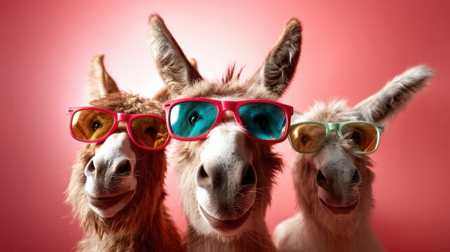 This whimsical image captures the joyful essence of three donkeys wearing vibrant sunglasses, showcasing their playful expressions against a bright, animated background.