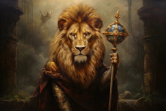 Lion, King, Renaissance, Medieval, Fantasy portrait, Painting, Wallpaper, Poster, Scepter. RETURN OF THE KING. Imposing ruler. Makes his return from exile to his fallen empire amidst crumbling ruins.