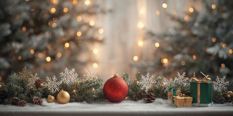 Christmas Decorations and Gift Boxes Arranged on Holiday Background