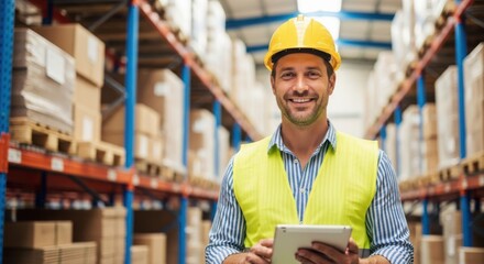 Warehouse worker with tablet in storage facility