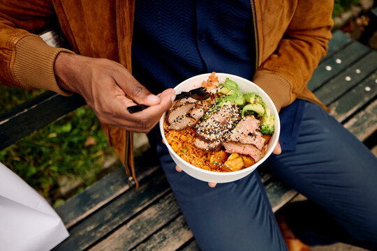 Man eats lunch outside from a takeout box