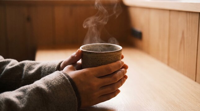 A person holds a warm cup of coffee in a moment of tranquility, the gentle steam rising, inviting the viewer to partake in the comforting ritual.