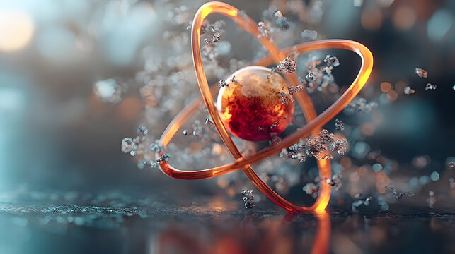 Vibrant atomic structure with glowing nucleus and orbiting electrons representing scientific discovery and innovation in a cosmic background