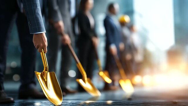 Faceless business leaders at groundbreaking ceremony defocused construction site background golden shovels visible business construction community investment growth theme
