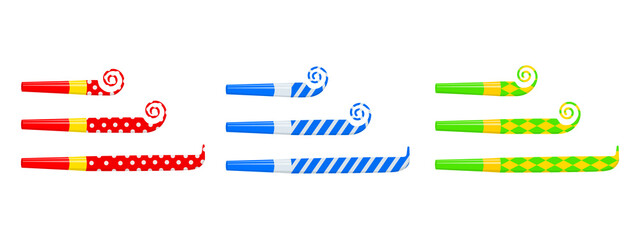 Rolled and unrolled party blowers, horns, noise makers. Collection of different sound whistles isolated on white background. Side view. Vector cartoon illustration.