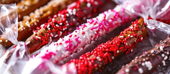 Valentine's Day themed pretzel rods with sprinkles, packaged in clear bags.