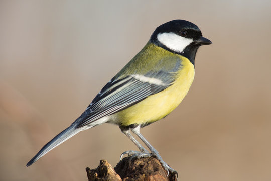 Colorful great tit ( Parus major ) perched on a tree trunk, photographed in horizontal, amazing background