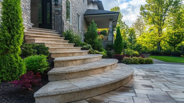 Stunning Paver Walkway: A Contemporary Entranceway to a Beautiful Home with Natural Stone Steps and Flagstone Veranda