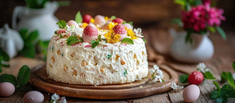 Easter paskha dessert decorated with flowers and fruits on a rustic wooden table setting showcasing traditional holiday elements
