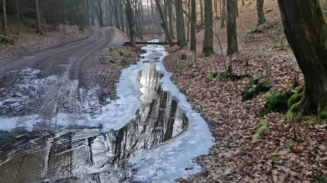 wading through a watercourse on a dirt road in a wooded valley. Ice and snow make the road less passable