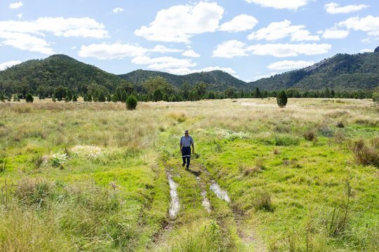Farmer checking to see if creek crossing is passable in paddock