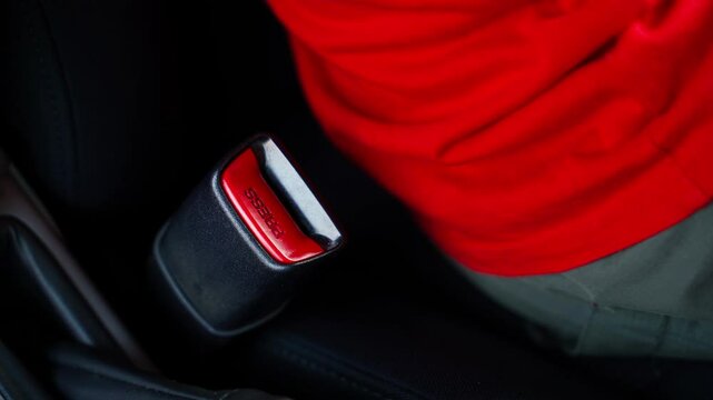 Beautiful happy senior woman in a blue blouse in the passenger seat in a car enjoying a trip