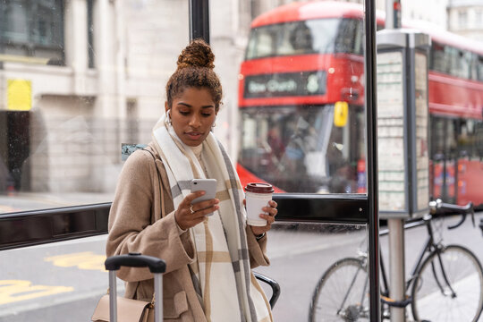 Self assured young black female in fashionable outfit messaging on smartphone and drinking takeaway coffee while waiting for bus in London