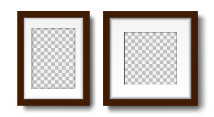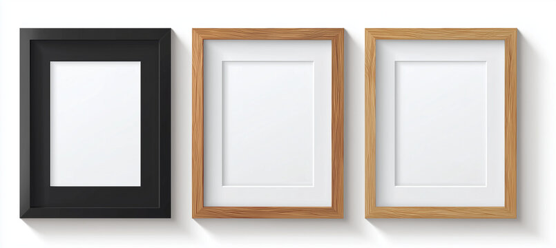 Set of white, and black horizontal wooden frames with passepartout hanging on a white wall. Blank elegant frame template, with copy space. Picture frame vector mockup.