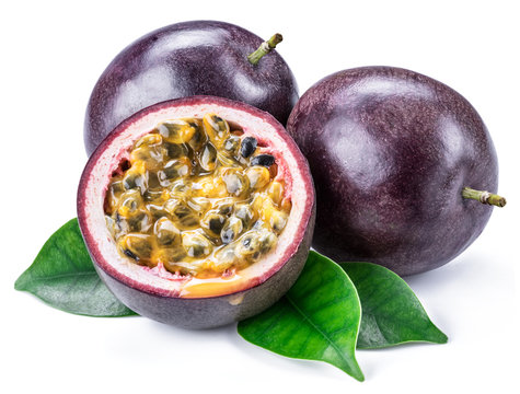 Passion fruits and its cross section with pulpy juice filled with seeds. White background.