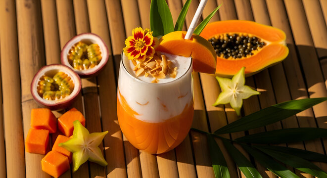 A refreshing tropical fruit smoothie with papaya and passion fruit arranged on a bamboo mat