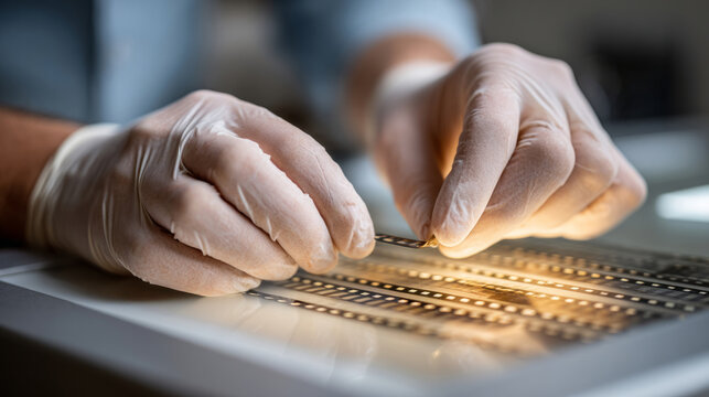 Hands wearing gloves handling photo negatives on light table for photography preservation and archiving