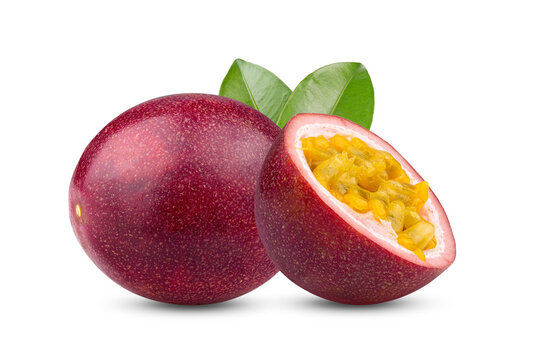 Passion fruit isolated. Ripe passion fruit, half and slice of fruit in drops of water on a white background.