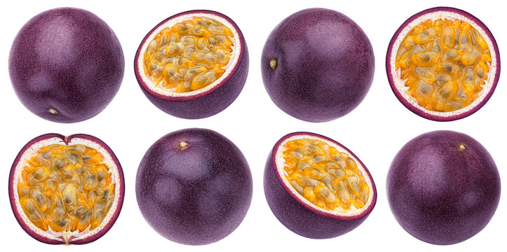 Close-up of fresh halved passion fruits on a plate with a spoon