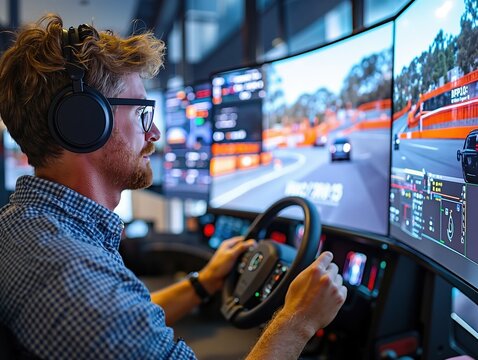 Young caucasian male engaging in virtual racing simulation at modern gaming setup