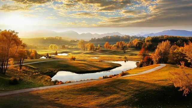 A fiery autumn sunset over a tranquil river and rural highway, with a car driving into the sun's warm glow on the horizon