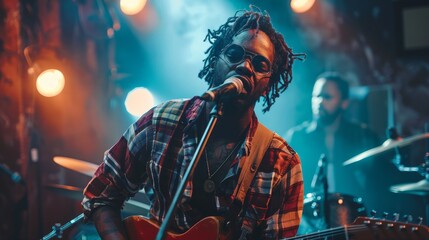 A passionate musician performs under colorful stage lights, capturing a moment of connection and expression in a lively musical atmosphere full of energy.
