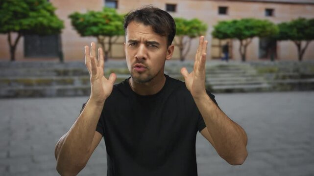 Young hispanic man gesturing passionately outdoors in front of blurred urban backdrop with trees and building creating an expressive yet frustrated look as he talks to the camera.