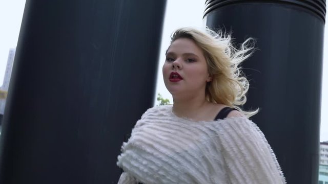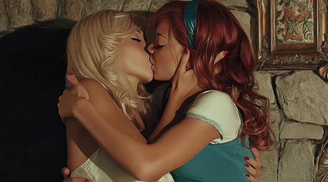 The dramatic moment when a young female couple—a stunning blonde with short hair and a beautiful brunette with long hair—confess their feelings and kiss passionately