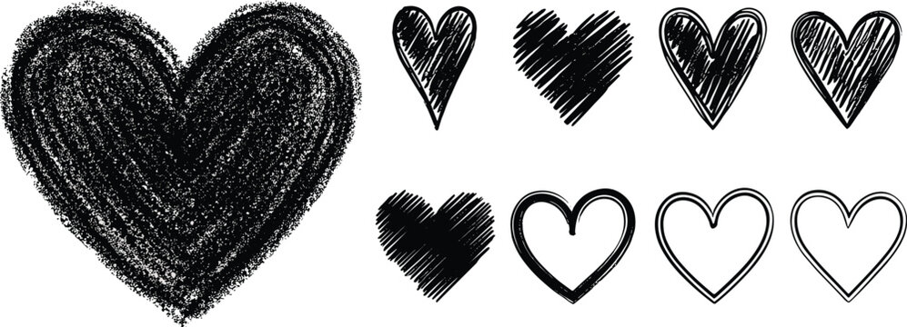 Hand drawn hearts collection. Artistic brush crayon pastel charcoal chalk drawn bold line linear heart shapes. Valentine's day artistic templates set. Rough, textured edge.