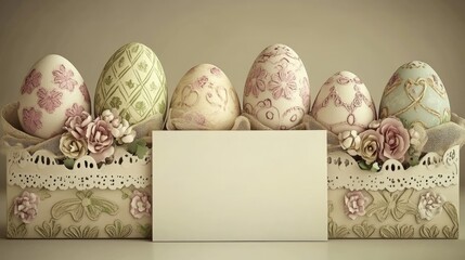 Intricately designed easter eggs on pastel background for spring greetings