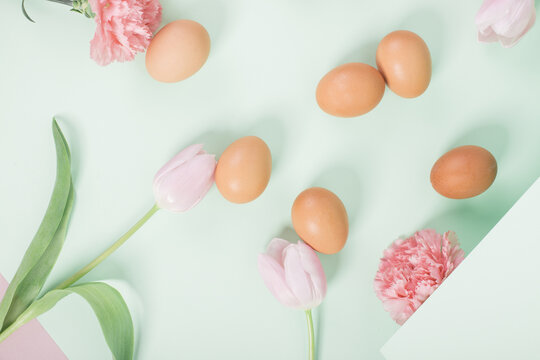 Easter monday celebration concept with pastel eggs and tulips