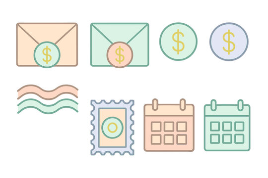 Icons representing financial transactions and scheduling elements in pastel colors featuring envelopes, coins, bills, and calendars