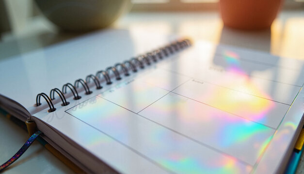 Spiral notebook with blank pages and holographic sheen on desk
