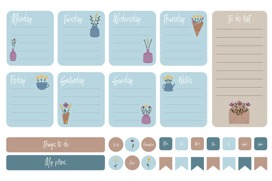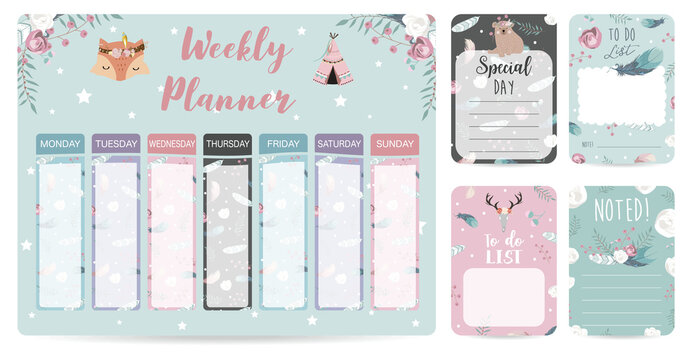 Weekly planner. Cute page for notes. Notebooks,decals, diary, school accessories. Cute romantic vector page.