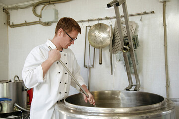 Worker operating pasteurizer using the control panel at the cheese or milk manufacturing