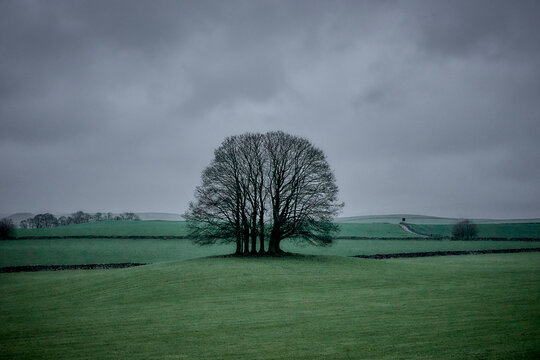 Coppice of trees in winter in pastoral setting in the Yorkshire Dales against grey sky