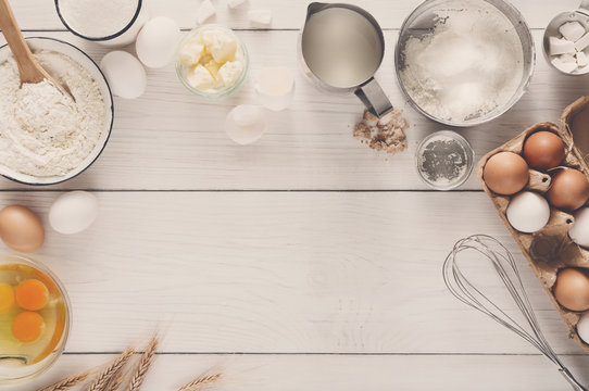 Baking utensils and cooking ingredients for tarts, cookies, dough and pastry. Flat lay with eggs, flour, sugar, berries.Top view, mockup for recipe, culinary classes, cooking blog.