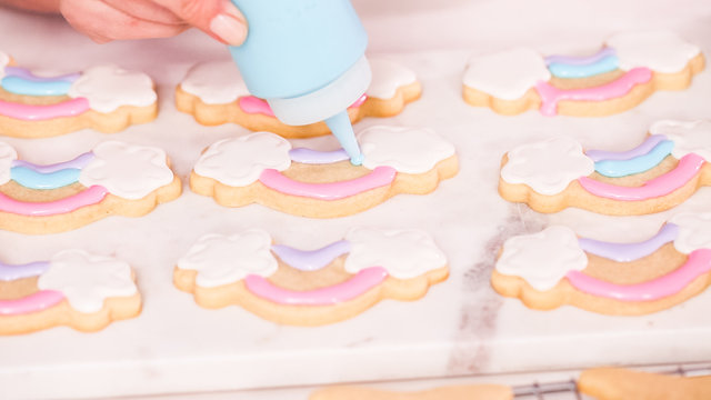 Decorating holiday cookies with icing. Focus is on hand decorating snowflake-shaped cookie