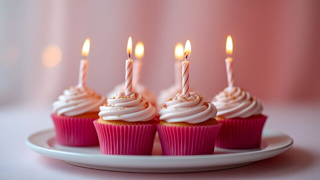 Colorful cupcakes with lit candles spelling "Happy Birthday" against a bokeh background, symbolizing celebration and joy