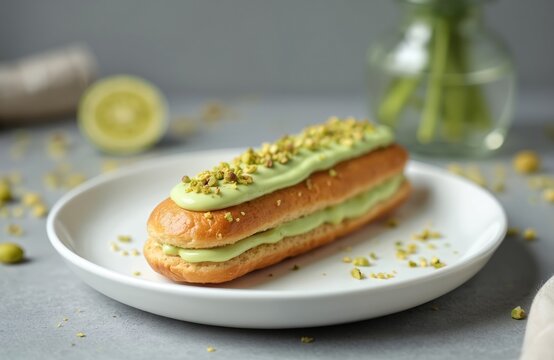 Enjoy delicious eclair filled with creamy pistachio custard, topped with crushed pistachios. Classic French pastry perfect for dessert lover bakery display, offering sweet, satisfying treat.