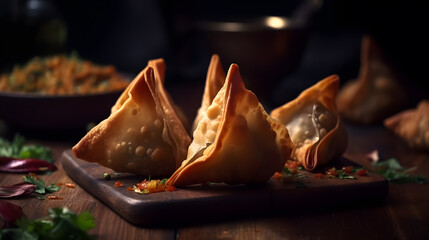 Abstract art. Colorful painting art of an exquisite plate of food. Samosas with crispy pastry filled with spiced meat or vegetables. Generative AI.