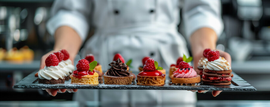 Smiling waitress holding tray of pastries in welcoming cafe setting
