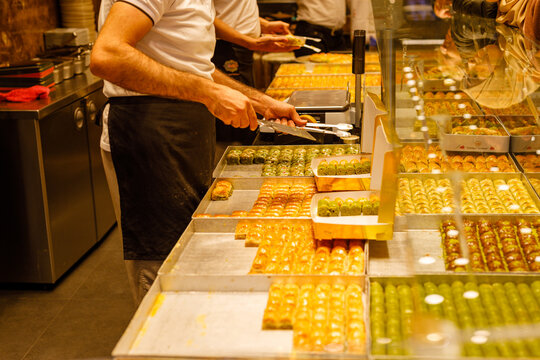 Traditional Turkish dessert Baklava, close-up trays of delicious baklava displayed in showcase of baklavalari shop